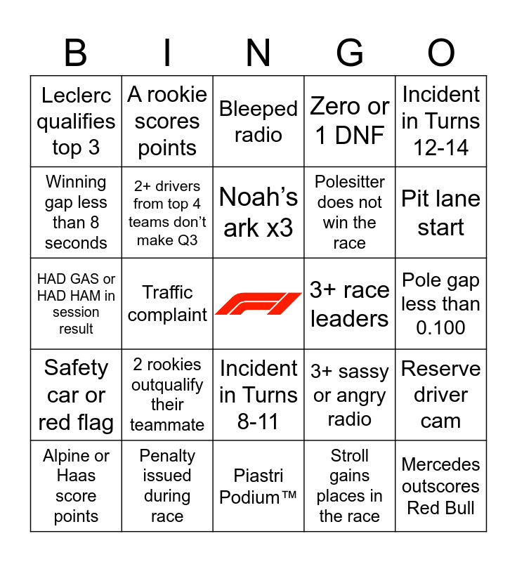 This bingo card has a free space and 27 words: 3+ sassy or angry radio, 10+ second pit stop, Polesitter does not win the race, Piastri Podium™️, Winning gap less than 8 seconds, Bleeped radio, A rookie scores points, Safety car or red flag, 3+ race leaders, Reserve driver cam, HAD GAS or HAD HAM in session result, Zero or 1 DNF, Alpine or Haas score points, Penalty issued during race, Pit lane start, Rain ☔️, 2+ drivers from top 4 teams don’t make Q3, Noah’s ark x3, 2 rookies outqualify their teammate, Leclerc qualifies top 3, Pole gap less than 0.100, Stroll gains places in the race, Traffic complaint, Mercedes outscores Red Bull, Incident in Turns 8-11, Incident in Turns 12-14 and Bearman gains places on opening lap.
