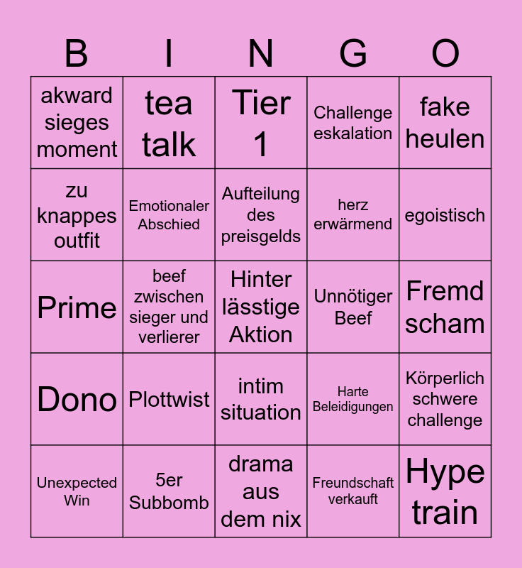 This bingo card has a free space and 24 words: Plottwist, 5er Subbomb, Aufteilung des preisgelds, Unexpected Win, fake heulen, akward sieges moment, zu knappes outfit, tea talk, Unnötiger Beef, intim situation, herz erwärmend, Prime, Harte Beleidigungen, Körperlich schwere challenge, Emotionaler Abschied, Freundschaft verkauft, Fremd scham, Tier 1, egoistisch, beef zwischen sieger und verlierer, Hype train, Dono, Challenge eskalation and drama aus dem nix.