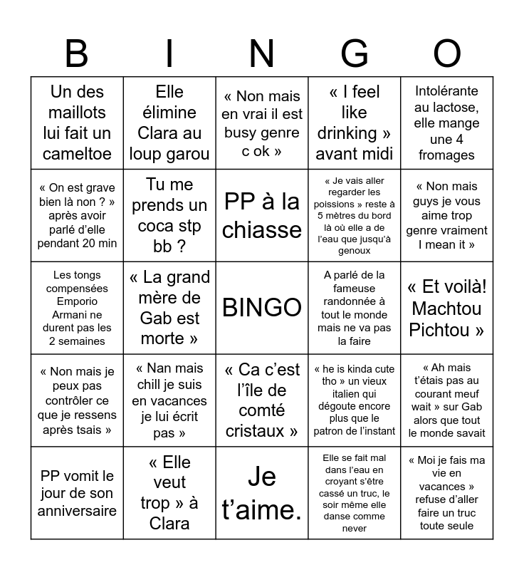 This bingo card has a free space and 24 words: « Nan mais chill je suis en vacances je lui écrit pas », « Elle veut trop » à Clara, PP à la chiasse, PP vomit le jour de son anniversaire, Intolérante au lactose, elle mange une 4 fromages, Un des maillots lui fait un cameltoe, « On est grave bien là non ? » après avoir parlé d’elle pendant 20 min, Elle élimine Clara au loup garou, A parlé de la fameuse randonnée à tout le monde mais ne va pas la faire, « Ca c’est l’île de comté cristaux », « Je vais aller regarder les poissions » reste à 5 mètres du bord là où elle a de l’eau que jusqu’à genoux, Les tongs compensées Emporio Armani ne durent pas les 2 semaines, « he is kinda cute tho » un vieux italien qui dégoute encore plus que le patron de l’instant, « Ah mais t’étais pas au courant meuf wait » sur Gab alors que tout le monde savait, Tu me prends un coca stp bb ?, Elle se fait mal dans l’eau en croyant s’être cassé un truc, le soir même elle danse comme never, « Et voilà! Machtou Pichtou », « Non mais en vrai il est busy genre c ok », « Non mais guys je vous aime trop genre vraiment I mean it », « La grand mère de Gab est morte », « Moi je fais ma vie en vacances » refuse d’aller faire un truc toute seule, « Non mais je peux pas contrôler ce que je ressens après tsais », « I feel like drinking » avant midi and Je t’aime..