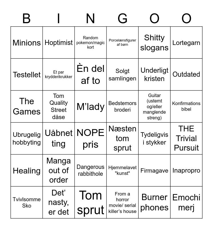 This bingo card has 47 words: Free!, The Games, Problematisk, Tydeligvis i stykker, Guitar (ustemt og/eller manglende streng), Hjemmelavet "kunst", Hoptimist, Funko Pop i æske, Lortegarn, Det’ nasty, er det, Testellet, Porcelænsfigurer af børn, Uåbnet ting, Ubrugelig hobbyting, Burner phones, Dangerous rabbithole, Et par krydderikrukker, Tom Quality Street dåse, “Gaming gear”, Shitty slogans, Outdated, THE Trivial Pursuit, Minions, Èn del af to, The Nugget Man, Solgt samlingen, NOPE pris, Militær grej, Konfirmations bibel, Bedstemors broderi, Sidste års julegave, Manga out of order, From a horror movie/ serial killer’s house, Emochi merj, Tom sprut, Næsten tom sprut, M’lady, Tvivlsomme Sko, Brugt hygiene, Firmagave, Healing, Random pokemon/magic kort, Underligt kristen, Souvenirs, Usorteret Lego, Inapropro and Det virker farligt.