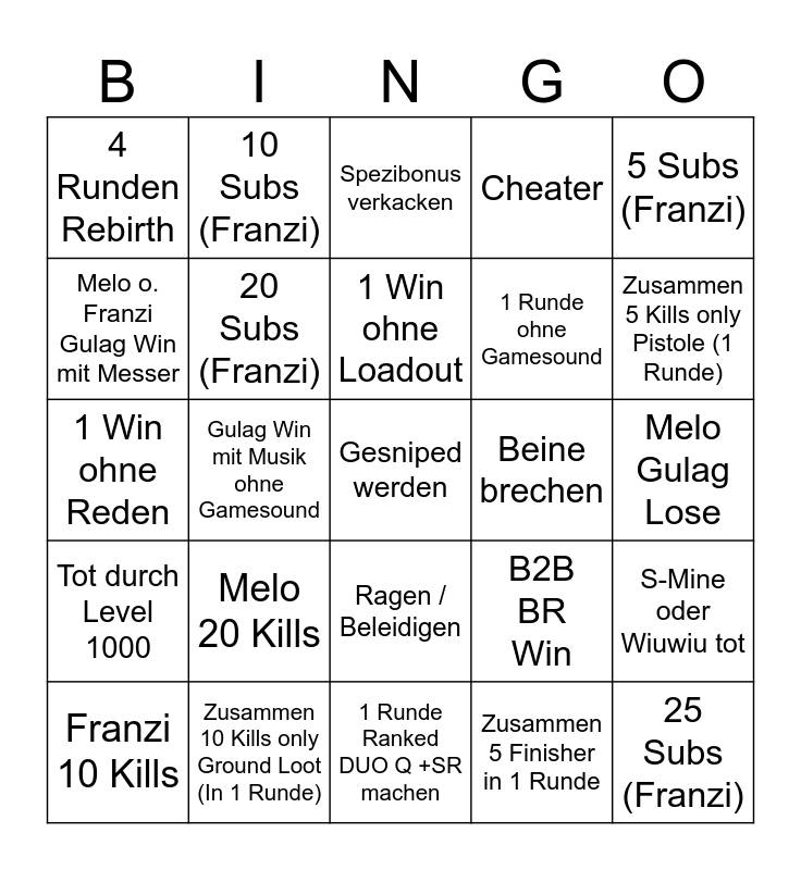 This bingo card has a free space and 24 words: Melo 20 Kills, Zusammen 10 Kills only Ground Loot (In 1 Runde), 1 Win ohne Loadout, Franzi 10 Kills, 5 Subs (Franzi), 4 Runden Rebirth, Melo o. Franzi Gulag Win mit Messer, 10 Subs (Franzi), Beine brechen, Ragen / Beleidigen, 1 Runde ohne Gamesound, 1 Win ohne Reden, B2B BR Win, S-Mine oder Wiuwiu tot, 20 Subs (Franzi), Zusammen 5 Finisher in 1 Runde, Melo Gulag Lose, Spezibonus verkacken, Zusammen 5 Kills only Pistole (1 Runde), Gulag Win mit Musik ohne Gamesound, 25 Subs (Franzi), Tot durch Level 1000, Cheater and 1 Runde Ranked DUO Q +SR machen.