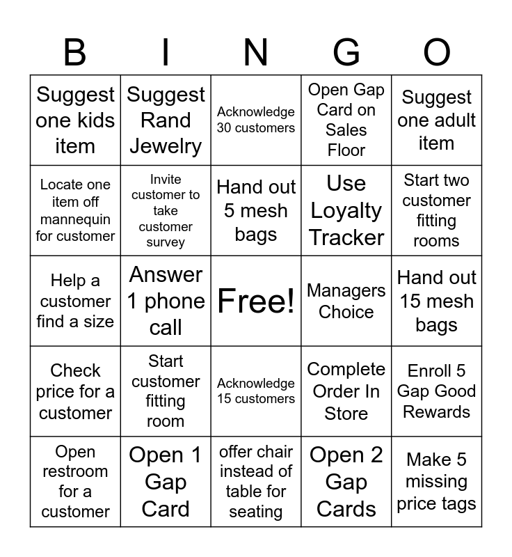 This bingo card has a free space and 24 words: Start customer fitting room, Open 1 Gap Card, Hand out 5 mesh bags, Open restroom for a customer, Suggest one adult item, Suggest one kids item, Locate one item off mannequin for customer, Suggest Rand Jewelry, Managers Choice, Acknowledge 15 customers, Use Loyalty Tracker, Help a customer find a size, Complete Order In Store, Enroll 5 Gap Good Rewards, Invite customer to take customer survey, Open 2 Gap Cards, Hand out 15 mesh bags, Acknowledge 30 customers, Start two customer fitting rooms, Answer 1 phone call, Make 5 missing price tags, Check price for a customer, Open Gap Card on Sales Floor and offer chair instead of table for seating.