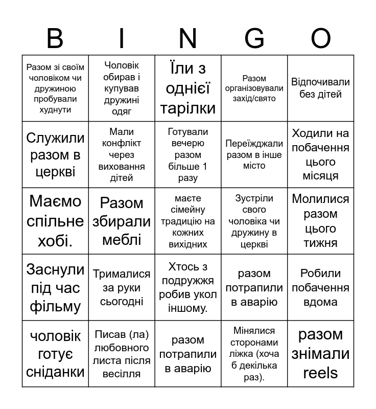 This bingo card has 38 words: Маємо трьох і більше дітей, Купали дітей разом, Мали весілля влітку, Мали конфлікт через виховання дітей, Робили побачення вдома, Трималися за руки сьогодні, Готували вечерю разом більше 1 разу, Їздили в спільну подорож цього літа, Відпочивали без дітей, Переїжджали разом в інше місто, Разом збирали меблі, Разом організовували захід/свято, маєте сімейну традицію на кожних вихідних, Молилися разом цього тижня, Служили разом в церкві, Заснули під час фільму, Сперечалися, хто виносить сміття, Їли з однієї тарілки, Одружені понад 10 років, Зустріли свого чоловіка чи дружину в церкві, Разом зі своїм чоловіком чи дружиною пробували худнути, Писав (ла) любовного листа після весілля, Ходили на побачення цього місяця, чоловік готує сніданки, разом десь заблукали, разом потрапили в аварію, разом знімали reels, чоловік був на пологах, разом порушили закон, хтось з нас спалив каструлю, Грали разом в настільну гру й посварились, Хтось з подружжя робив укол іншому., Мінялися сторонами ліжка (хоча б декілька раз)., Чоловік обирав і купував дружині одяг, Повертали подарунок чоловіка або дружини в магазин, разом потрапили в аварію, Маємо спільне хобі. and маємо спільни1 страх.
