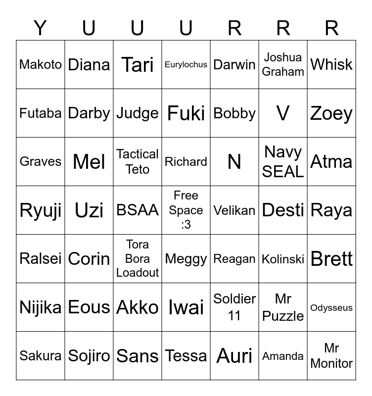 This bingo card has a free space and 48 words: Soldier 11, V, Tessa, Uzi, Tactical Teto, Raya, Diana, Sojiro, Joshua Graham, Meggy, Whisk, Eurylochus, Navy SEAL, N, Nijika, Desti, Futaba, Zoey, Mr Puzzle, Darwin, Bobby, BSAA, Makoto, Darby, Odysseus, Judge, Atma, Sakura, Richard, Mel, Amanda, Velikan, Brett, Eous, Ryuji, Reagan, Kolinski, Graves, Tora Bora Loadout, Akko, Ralsei, Mr Monitor, Tari, Sans, Fuki, Iwai, Corin and Auri.