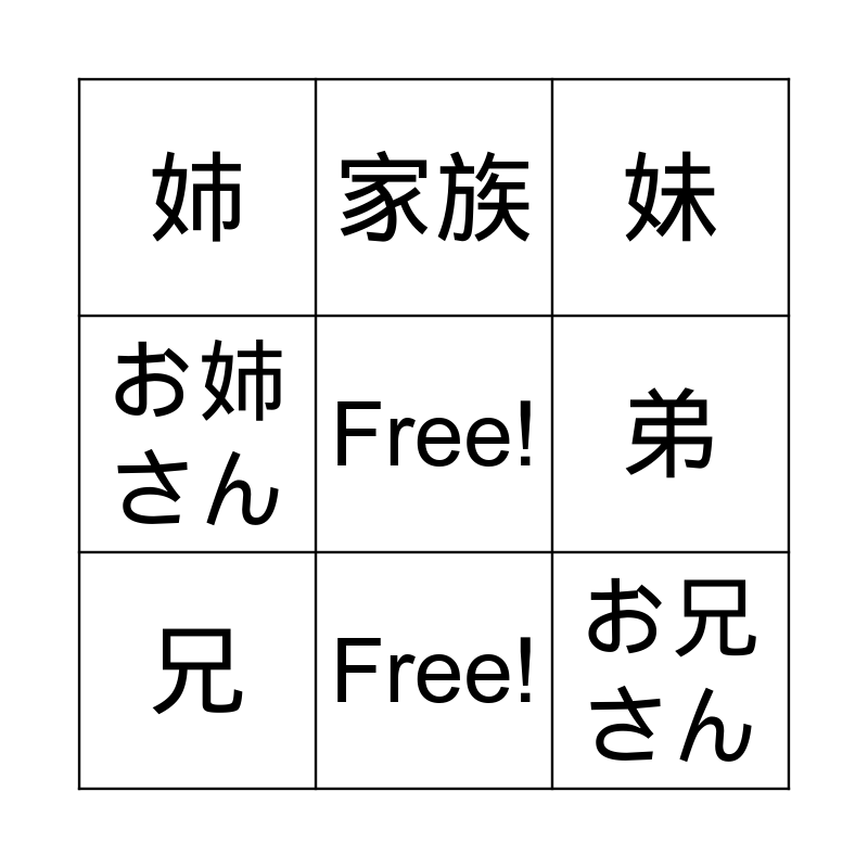 This bingo card has a free space and 8 words: 弟, 妹, 家族, 兄, 姉, お兄さん, お姉さん and Free!.