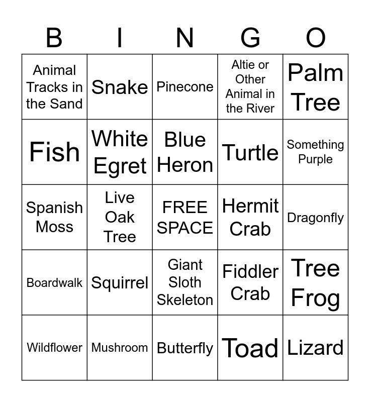 This bingo card has a free space and 24 words: Squirrel, Mushroom, Blue Heron, Wildflower, Palm Tree, Animal Tracks in the Sand, Fish, Snake, Hermit Crab, Giant Sloth Skeleton, Turtle, Spanish Moss, Fiddler Crab, Tree Frog, White Egret, Toad, Dragonfly, Pinecone, Something Purple, Live Oak Tree, Lizard, Boardwalk, Altie or Other Animal in the River and Butterfly.