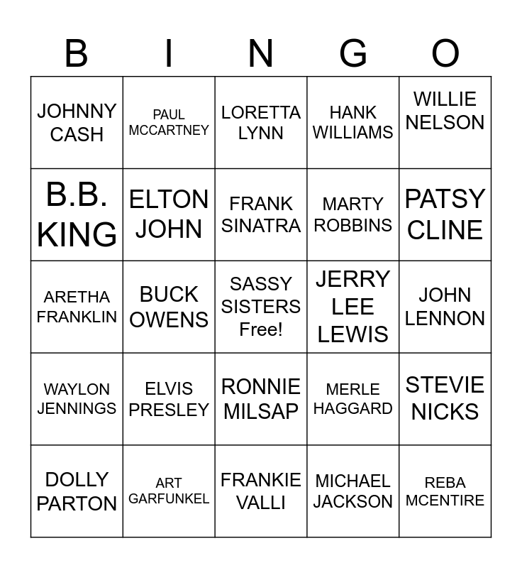 This bingo card has a free space and 24 words: DOLLY PARTON, ELVIS PRESLEY, FRANK SINATRA, MICHAEL JACKSON, WILLIE NELSON, JOHNNY CASH, PAUL MCCARTNEY, LORETTA LYNN, JERRY LEE LEWIS, JOHN LENNON, ARETHA FRANKLIN, ELTON JOHN, MERLE HAGGARD, STEVIE NICKS, B.B. KING, ART GARFUNKEL, FRANKIE VALLI, HANK WILLIAMS, PATSY CLINE, WAYLON JENNINGS, BUCK OWENS, RONNIE MILSAP, MARTY ROBBINS and REBA MCENTIRE.