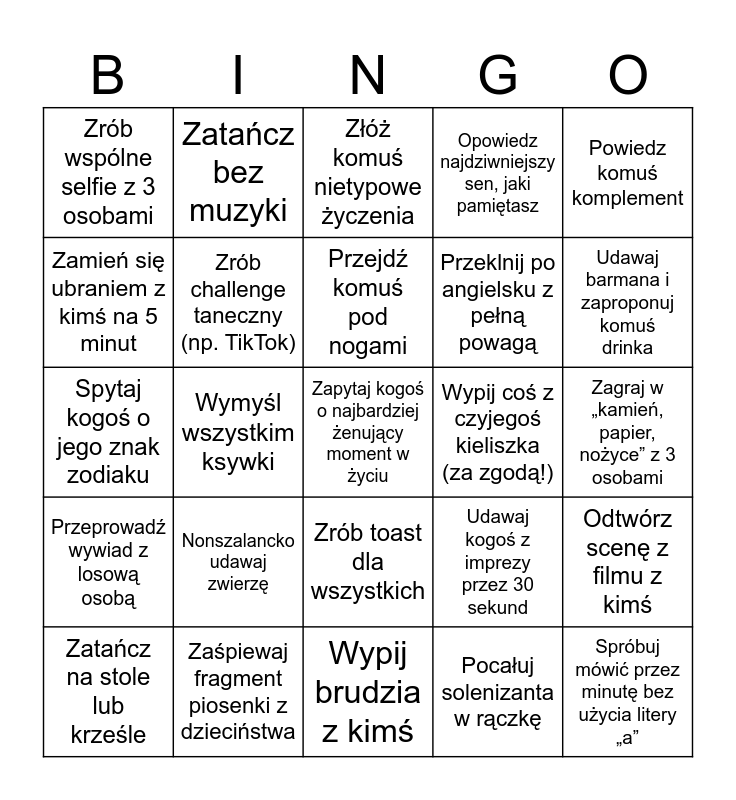 This bingo card has 25 words: Nonszalancko udawaj zwierzę, Wypij brudzia z kimś, Przejdź komuś pod nogami, Zatańcz na stole lub krześle, Powiedz komuś komplement, Zrób wspólne selfie z 3 osobami, Zamień się ubraniem z kimś na 5 minut, Zatańcz bez muzyki, Wypij coś z czyjegoś kieliszka (za zgodą!), Zrób toast dla wszystkich, Przeklnij po angielsku z pełną powagą, Spytaj kogoś o jego znak zodiaku, Udawaj kogoś z imprezy przez 30 sekund, Odtwórz scenę z filmu z kimś, Zrób challenge taneczny (np. TikTok), Spróbuj mówić przez minutę bez użycia litery „a”, Zagraj w „kamień, papier, nożyce” z 3 osobami, Złóż komuś nietypowe życzenia, Udawaj barmana i zaproponuj komuś drinka, Wymyśl wszystkim ksywki, Zapytaj kogoś o najbardziej żenujący moment w życiu, Zaśpiewaj fragment piosenki z dzieciństwa, Przeprowadź wywiad z losową osobą, Opowiedz najdziwniejszy sen, jaki pamiętasz and Pocałuj solenizanta w rączkę.