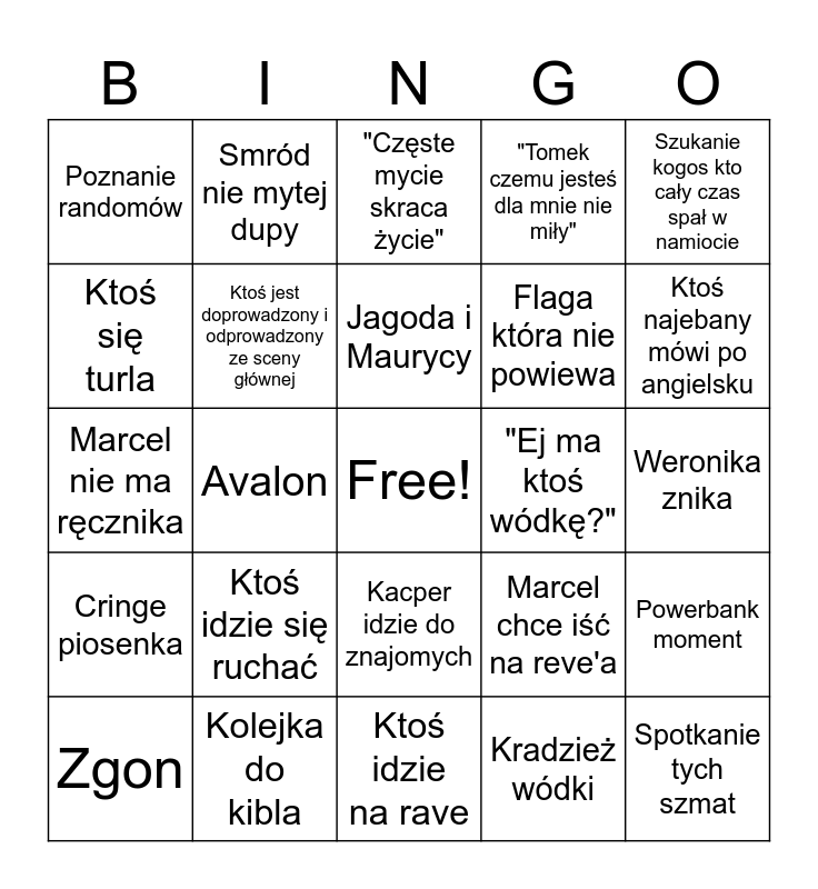 This bingo card has a free space and 29 words: Jagoda traci głos, Kolejka do kibla, "Częste mycie skraca życie", Wycieczka do biedronki, Szukanie kogos kto cały czas spał w namiocie, Poznanie randomów, Ktoś jest doprowadzony i odprowadzony ze sceny głównej, Jagoda i Maurycy, "Ej ma ktoś wódkę?", Powerbank moment, Zgon, Avalon, Kradzież wódki, Spotkanie tych szmat, Marcel nie ma ręcznika, Poranna yoga, Ktoś idzie na rave, Marcel chce iść na reve'a, Ktoś najebany mówi po angielsku, Cringe piosenka, Ktoś idzie się ruchać, Kurwienie na pedały, Flaga która nie powiewa, Weronika znika, Ktoś się turla, Smród nie mytej dupy, Kacper idzie do znajomych, "Tomek czemu jesteś dla mnie nie miły" and Avalon znika XD.