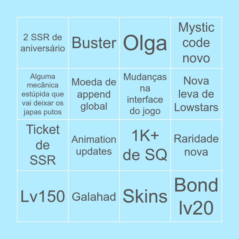 This bingo card has 16 words: Galahad, Raridade nova, Olga, 2 SSR de aniversário, Ticket de SSR, Buster, 1K+ de SQ, Skins, Alguma mecânica estúpida que vai deixar os japas putos, Moeda de append global, Lv150, Mystic code novo, Animation updates, Nova leva de Lowstars, Mudanças na interface do jogo and Bond lv20.