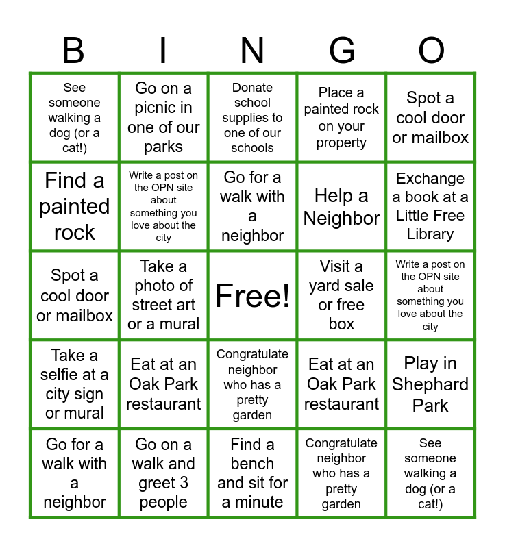 This bingo card has a free space and 63 words: Say Hello to our Mayor, Attend a local event or festival, Visit the Oak Park Library, Play in Shephard Park, Compliment a neighbor, Attend an Oak Park Council meeting, Go on a picnic in one of our parks, Exchange a book at a Little Free Library, Go for a walk with a neighbor, Donate to a local pantry or charity, Congratulate neighbor who has a pretty garden, Eat ice cream, Write a post on the OPN site about something you love about the city, Spot a cool door or mailbox, Visit a yard sale or free box, Find a painted rock, Take a photo of street art or a mural, See someone walking a dog (or a cat!), Go on a walk and greet 3 people, Help a Neighbor, Eat at an Oak Park restaurant, Take a selfie at a city sign or mural, Place a painted rock on your property, See a house flying a flag (any kind!), Find a bench and sit for a minute, Say hello to one of our public safety officers, Attend a neighboring city event, Say Hello to our Mayor, Attend a local event or festival, Visit the Oak Park Library, Play in Shephard Park, Compliment a neighbor, Attend an Oak Park Council meeting, Go on a picnic in one of our parks, Exchange a book at a Little Free Library, Go for a walk with a neighbor, Donate to a local pantry or charity, Congratulate neighbor who has a pretty garden, Eat ice cream, Write a post on the OPN site about something you love about the city, Spot a cool door or mailbox, Visit a yard sale or free box, Find a painted rock, Take a photo of street art or a mural, See someone walking a dog (or a cat!), Go on a walk and greet 3 people, Help a Neighbor, Eat at an Oak Park restaurant, Take a selfie at a city sign or mural, Place a painted rock on your property, See a house flying a flag (any kind!), Find a bench and sit for a minute, Say hello to one of our public safety officers, Attend a neighboring city event, Bake Cookies, Donate school supplies to one of our schools, Fly a kite, Go to a metro park or state park, Visit the DIA, Visit the Detroit Zoo, Share a positive story about Oak Park, Sit on your porch and relax and Spot a neighbor's bird feeder.