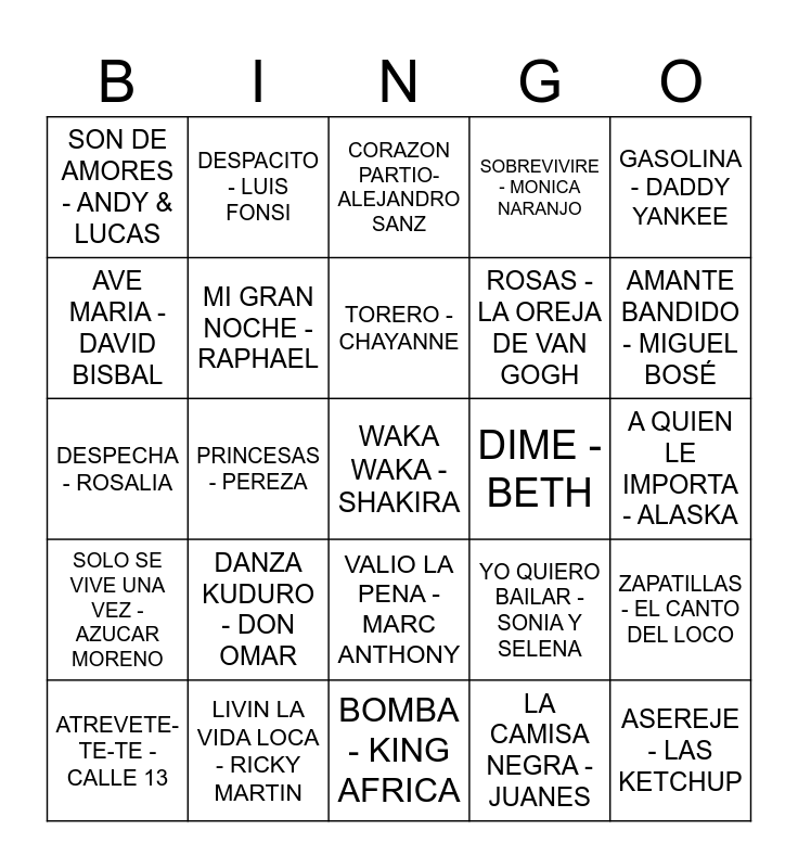 This bingo card has a free space and 51 words: Free!, ASEREJE - LAS KETCHUP, LA MACARENA - LOS DEL RIO, BOMBA - KING AFRICA, DANZA KUDURO - DON OMAR, BAILANDO - ENRIQUE IGLESIAS, DESPACITO - LUIS FONSI, MALAMENTE - ROSALIA, AVE MARIA - DAVID BISBAL, CORAZON LATINO - DAVID BISBAL, MI GRAN NOCHE - RAPHAEL, SOBREVIVIRE - MONICA NARANJO, ZAPATILLAS - EL CANTO DEL LOCO, YO QUIERO BAILAR - SONIA Y SELENA, QUE LA DETENGAN - DAVID CIVERA, SUEÑO SU BOCA - RAUL, TORERO - CHAYANNE, DIME - BETH, LA RAJA DE TU FALDA - ESTOPA, GASOLINA - DADDY YANKEE, PRINCESAS - PEREZA, LA CAMISA NEGRA - JUANES, SON DE AMORES - ANDY & LUCAS, ROSAS - LA OREJA DE VAN GOGH, CUANDO ZARPA EL AMOR - CAMELA, SUAVEMENTE - ELVIS CRESPO, AMANTE BANDIDO - MIGUEL BOSÉ, LA BILIRRUBINA - JUAN LUIS GUERRA, ATREVETE-TE-TE - CALLE 13, CORAZON PARTIO- ALEJANDRO SANZ, EL BAILE DEL GORILA - MELODY, LA BARBACOA - GEORGIE DANN, ANTES MUERTA QUE SENCILLA - MARIA ISABEL, DESATAME - MONICA NARANJO, NO ROMPAS MÁS - COYOTE DAX, LIVIN LA VIDA LOCA - RICKY MARTIN, MAMBO NO.5 - LOU BEGA, LA BICICLETA - CARLOS VIVES FT SHAKIRA, AI SE EU TE PEGO - MICHEL TELO, SARANDONGA - LOLITA, A QUIEN LE IMPORTA - ALASKA, SOLO SE VIVE UNA VEZ - AZUCAR MORENO, SI ANTES TE HUBIERA CONOCIDO - KAROL G, MAYONESA - CHOCOLATE, Y YO SIGO AQUI - PAULINA RUBIO, DEVUELVEME LA VIDA - DAVID BUSTAMANTE, DESPECHA - ROSALIA, DEVORAME OTRA VEZ - AZÚCAR MORENO, LA VIDA ES UN CARNAVAL - CELIA CRUZ, VALIO LA PENA - MARC ANTHONY and CARMEN - LOS CHUNGUITOS.
