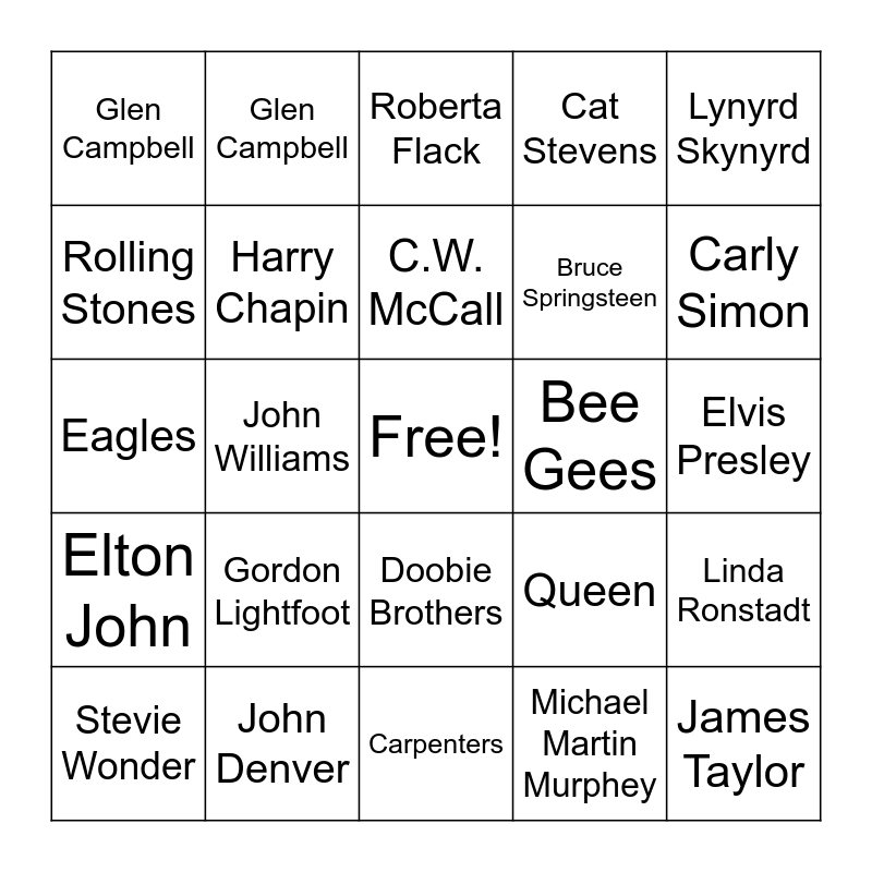 This bingo card has a free space and 49 words: America, James Taylor, Guess Who, Carpenters, Gordon Lightfoot, Ray Stevens, Glen Campbell, Dolly Parton, Rolling Stones, Grand Funk Railroad, Harry Chapin, Cat Stevens, Linda Ronstadt, Queen, Captain & Tennille, ABBA, C.W. McCall, Bee Gees, Kiss, Lynyrd Skynyrd, John Williams, Michael Martin Murphey, Glen Campbell, Bruce Springsteen, Carl Douglas, Carly Simon, Stevie Wonder, Pink Floyd, Doobie Brothers, Elton John, Olivia Newton John, Deep Purple, Chicago, Tony Orlando & Dawn, John Denver, B.W. Stevenson, Brownsville Station, April Wine, Elvis Presley, Rod Stewart, Alice Cooper, Neil Diamond, Helen Reddy, Neil Young, Eagles, Roberta Flack, Lighthouse, Eric Weissberg and Led Zeppelin.
