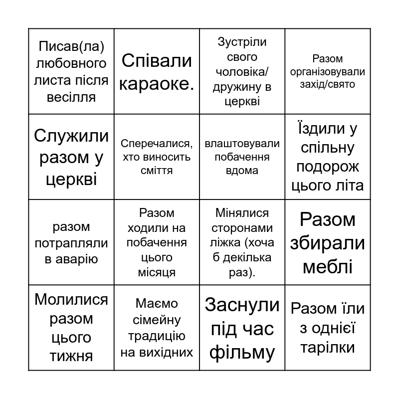 This bingo card has 37 words: Маємо трьох або більше дітей, Купали дітей разом, Пережили конфлікт через виховання дітей, влаштовували побачення вдома, Трималися за руки сьогодні, Готували вечерю разом більше 1 разу, Їздили у спільну подорож цього літа, Відпочивали без дітей, Служили разом у церкві, Переїжджали разом в інше місто, Разом збирали меблі, Разом організовували захід/свято, Молилися разом цього тижня, Заснули під час фільму, Сперечалися, хто виносить сміття, Разом їли з однієї тарілки, Є одруженими понад 10 років, Зустріли свого чоловіка/дружину в церкві, Разом з чоловіком/дружиною пробували худнути, Маємо сімейну традицію на вихідних, Писав(ла) любовного листа після весілля, Разом ходили на побачення цього місяця, Чоловік робить сніданки, Разом десь заблукали, Разом знімали Reels, Боїмось чогось обоє., Співали караоке., Чоловік був присутнім на пологах, Хтось з нас спалив каструлю, Разом порушили закон, Грали разом в настільну гру й посварились, Хтось з подружжя робив укол іншому., Мінялися сторонами ліжка (хоча б декілька раз)., Чоловік обирав і купував дружині одяг, Повертали подарунок чоловіка або дружини в магазин, разом потрапляли в аварію and Маємо спільне хобі..