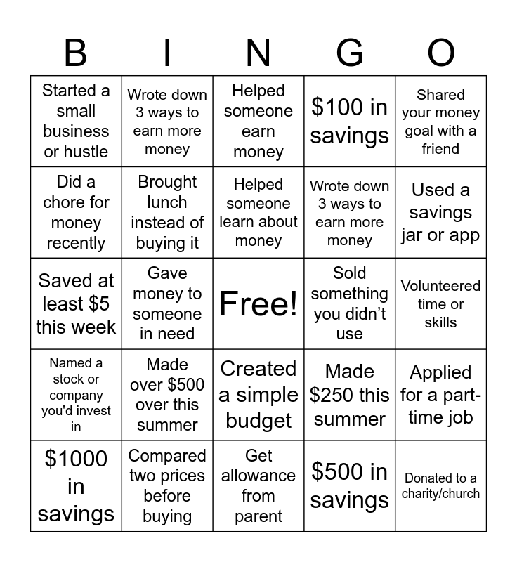 This bingo card has a free space and 24 words: Made over $500 over this summer, Compared two prices before buying, Helped someone learn about money, $1000 in savings, Shared your money goal with a friend, Started a small business or hustle, Did a chore for money recently, Wrote down 3 ways to earn more money, Sold something you didn’t use, Created a simple budget, Wrote down 3 ways to earn more money, Saved at least $5 this week, Made $250 this summer, Applied for a part-time job, Brought lunch instead of buying it, $500 in savings, Volunteered time or skills, Helped someone earn money, Used a savings jar or app, Gave money to someone in need, Donated to a charity/church, Named a stock or company you'd invest in, $100 in savings and Get allowance from parent.