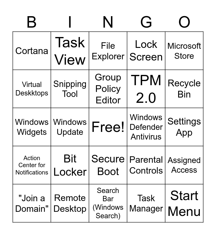 This bingo card has a free space and 24 words: Bit Locker, Remote Desktop, Group Policy Editor, "Join a Domain", Microsoft Store, Cortana, Virtual Deskktops, Task View, Windows Defender Antivirus, Secure Boot, TPM 2.0, Windows Widgets, Parental Controls, Assigned Access, Snipping Tool, Task Manager, Settings App, File Explorer, Recycle Bin, Windows Update, Start Menu, Action Center for Notifications, Lock Screen and Search Bar (Windows Search).