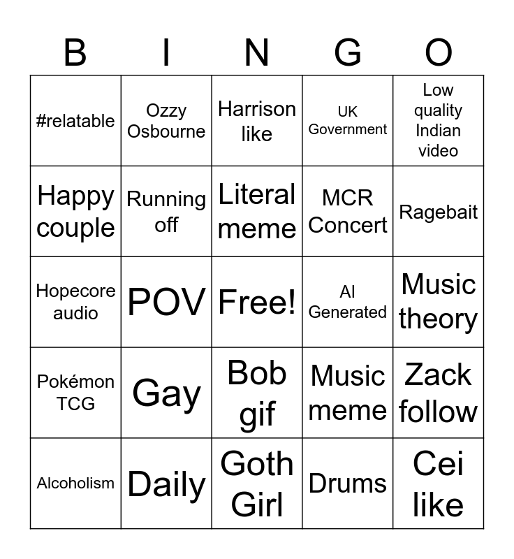 This bingo card has a free space and 24 words: Gay, Daily, Literal meme, Alcoholism, Low quality Indian video, #relatable, Happy couple, Ozzy Osbourne, AI Generated, Bob gif, MCR Concert, Hopecore audio, Music meme, Zack follow, Running off, Drums, Music theory, Harrison like, Ragebait, POV, Cei like, Pokémon TCG, UK Government and Goth Girl.