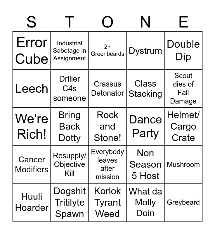 This bingo card has a free space and 24 words: Resupply/ Objective Kill, Dogshit Tritilyte Spawn, Crassus Detonator, Huuli Hoarder, Double Dip, Error Cube, Leech, Industrial Sabotage in Assignment, Dance Party, Everybody leaves after mission, Class Stacking, We're Rich!, Non Season 5 Host, Mushroom, Driller C4s someone, What da Molly Doin, Helmet/ Cargo Crate, 2+ Greenbeards, Scout dies of Fall Damage, Bring Back Dotty, Greybeard, Cancer Modifiers, Dystrum and Korlok Tyrant Weed.