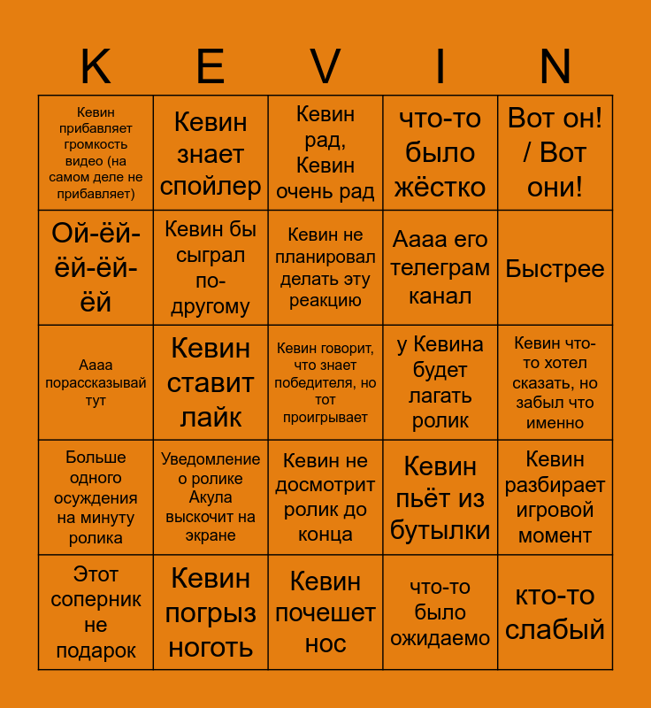 This bingo card has 25 words: Уведомление о ролике Акула выскочит на экране, Кевин почешет нос, Кевин не планировал делать эту реакцию, Этот соперник не подарок, Вот он! / Вот они!, Кевин прибавляет громкость видео (на самом деле не прибавляет), Ой-ёй-ёй-ёй-ёй, Кевин знает спойлер, у Кевина будет лагать ролик, Кевин не досмотрит ролик до конца, Аааа его телеграм канал, Аааа порассказывай тут, Кевин пьёт из бутылки, Кевин разбирает игровой момент, Кевин бы сыграл по-другому, кто-то слабый, Кевин что-то хотел сказать, но забыл что именно, Кевин рад, Кевин очень рад, Быстрее, Кевин ставит лайк, Кевин говорит, что знает победителя, но тот проигрывает, Кевин погрыз ноготь, Больше одного осуждения на минуту ролика, что-то было жёстко and что-то было ожидаемо.
