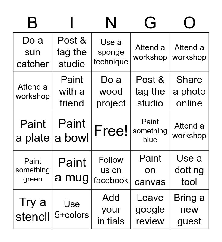 This bingo card has a free space and 24 words: Paint a mug, Use 5+colors, Do a wood project, Try a stencil, Attend a workshop, Do a sun catcher, Attend a workshop, Post & tag the studio, Paint something blue, Follow us on facebook, Post & tag the studio, Paint a plate, Paint on canvas, Use a dotting tool, Paint with a friend, Leave google review, Attend a workshop, Use a sponge technique, Share a photo online, Paint a bowl, Bring a new guest, Paint something green, Attend a workshop and Add your initials.
