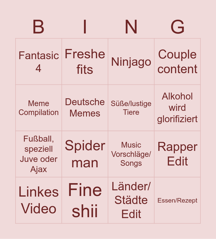 This bingo card has 16 words: Fine shii, Rapper Edit, Ninjago, Fantasic 4, Fußball, speziell Juve oder Ajax, Freshe fits, Music Vorschläge/ Songs, Länder/ Städte Edit, Meme Compilation, Deutsche Memes, Linkes Video, Couple content, Spider man, Alkohol wird glorifiziert, Süße/lustige Tiere and Essen/Rezept.