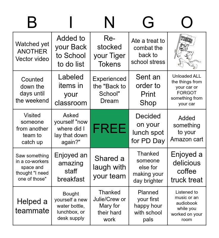 This bingo card has 1 images, a free space and 23 words: Enjoyed an amazing staff breakfast, Bought yourself a new water bottle, lunchbox, or desk supply, Experienced the "Back to School" Dream, Helped a teammate, Watched yet ANOTHER Vector video, Counted down the days until the weekend, Added to your Back to School to do list, Decided on your lunch spot for PD Day, Shared a laugh with your team, Sent an order to Print Shop, Visited someone from another team to catch up, Thanked someone else for making your day brighter, Enjoyed a delicious coffee truck treat, Labeled items in your classroom, Planned your first happy hour with school pals, Added something to your Amazon cart, Re-stocked your Tiger Tokens, Unloaded ALL the things from your car or FORGOT something from your car, Asked yourself "now where did I lay that down again?", Listened to music or an audiobook while you worked on your room, Saw something in a co-workers space and thought "I need one of those", Ate a treat to combat the back to school stress and Thanked Julie/Crew or Mary for their hard work.