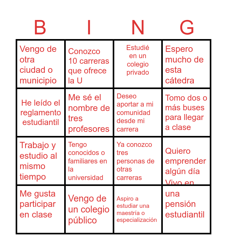 This bingo card has 24 words: Sueño con hacer un intercambio internacional, Vine con sueño a clase hoy, Tomo dos o más buses para llegar a clase, Conozco al menos un símbolo institucional, He leído el reglamento estudiantil, Vengo de otra ciudad o municipio, Me sé el nombre de tres profesores, Conozco 10 carreras que ofrece la U, Vengo de un colegio público, Sé cuáles son las ciudades donde se encuentra la U, Trabajo y estudio al mismo tiempo, Ya conozco tres personas de otras carreras, Conozco un semillero o grupo estudiantil, Me cuesta hablar en voz alta, Deseo aportar a mi comunidad desde mi carrera, Conozco el nombre del rector, Aspiro a estudiar una maestría o especialización, Estudié en un colegio privado, Tengo conocidos o familiares en la universidad, Quiero emprender algún día, Me gusta participar en clase, Vivo en una pensión estudiantil, Espero mucho de esta cátedra and Vine con sueño a clase hoy.