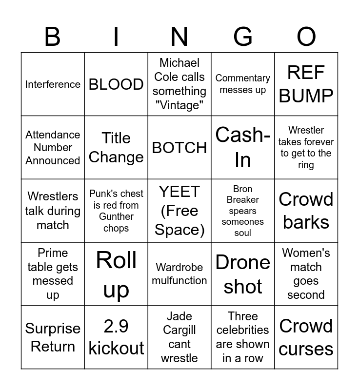 This bingo card has a free space and 34 words: Crowd sings entrance music, Three celebrities are shown in a row, Peacock messes up for five seconds, Match is annoyingly sponsored, Prime table gets messed up, Title Change, REF BUMP, Surprise Return, BLOOD, "This Is Awesome", BOTCH, Michael Cole calls something "Vintage", Heel turn/Face Turn, Table break, Bron Breaker spears someones soul, Wrestler takes forever to get to the ring, 2.9 kickout, Wrestlers talk during match, Roll up, Drone shot, Wardrobe mulfunction, Someone accidently hits their tag partner, Interference, Crowd barks, Jade Cargill cant wrestle, Crowd curses, Commentary messes up, Cardi B, Cash-In, Attendance Number Announced, Social Media views are brought up, Punk's chest is red from Gunther chops, Women's match goes second and Alexa and Charlotte argue.