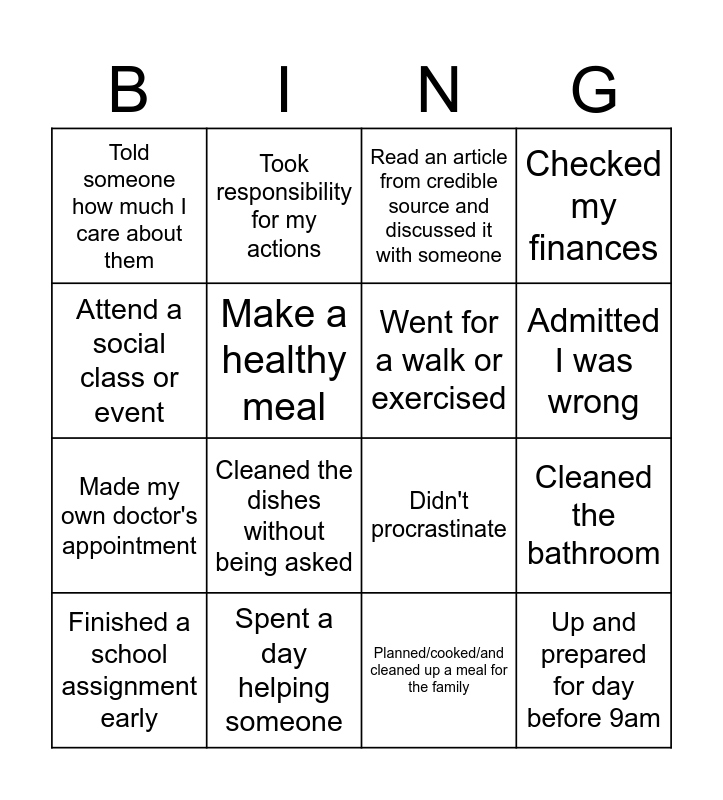 This bingo card has 20 words: Finished a school assignment early, Didn't hit the snooze button, Read an article from credible source and discussed it with someone, Cleaned the bathroom, Folded and put away all of the laundry, Cleaned the dishes without being asked, Planned/cooked/and cleaned up a meal for the family, Checked my finances, Made my own doctor's appointment, Took responsibility for my actions, Didn't procrastinate, Admitted I was wrong, Told someone how much I care about them, Spent a day helping someone, Went for a walk or exercised, Cleaned my room, Attend a social class or event, Make a healthy meal, Use a coping skill and Up and prepared for day before 9am.