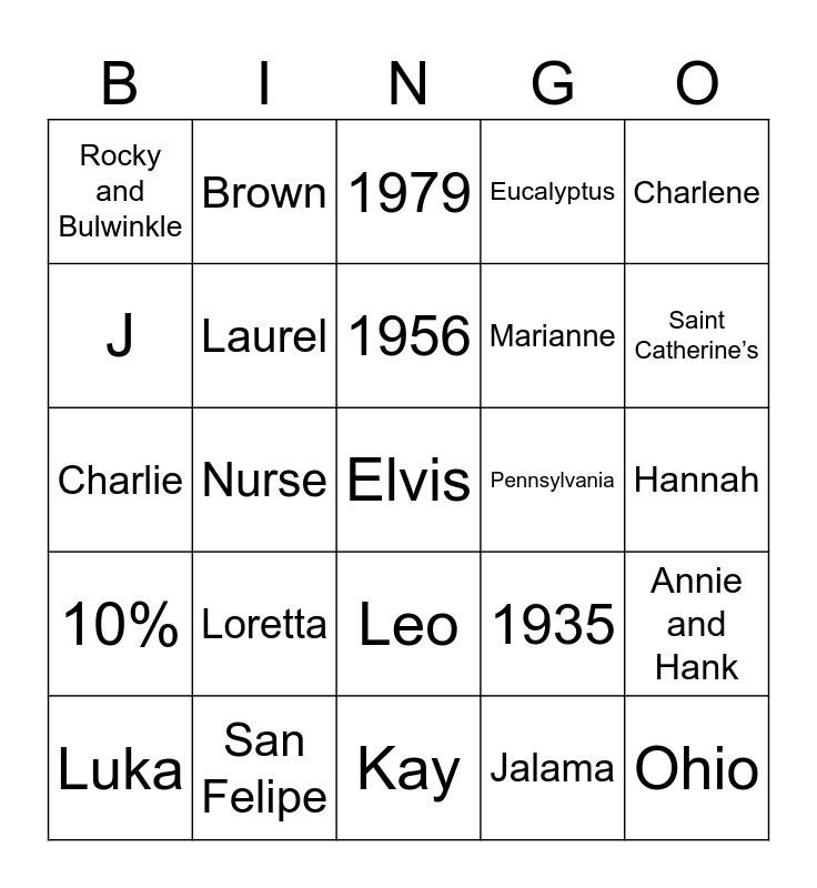 This bingo card has 40 words: Free!, Charlie, USA, Laurel, San Felipe, Leo, 1956, Costa Rica, Charlene, 10%, Nurse, Eucalyptus, Elvis, Hannah, Pennsylvania, Loretta, Saturday, Rocky and Bulwinkle, Grace, 1979, Annie and Hank, Jalama, Marianne, J, Aliquippa, Herbert Hoover, Laverne, Gardening, Ohio, Bill, CHVA, Luka, Blueberries., 1935, Saint Catherine’s, Kay, Studebaker Hawk, 30, Brown and Frank Sinatra.