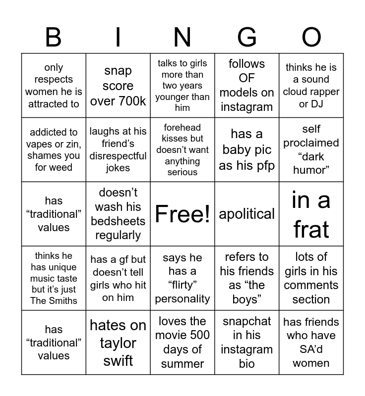 This bingo card has a free space and 24 words: has “traditional” values, has a gf but doesn’t tell girls who hit on him, forehead kisses but doesn’t want anything serious, snapchat in his instagram bio, thinks he is a sound cloud rapper or DJ, only respects women he is attracted to, snap score over 700k, talks to girls more than two years younger than him, apolitical, in a frat, has “traditional” values, laughs at his friend’s disrespectful jokes, refers to his friends as “the boys”, lots of girls in his comments section, addicted to vapes or zin, shames you for weed, hates on taylor swift, loves the movie 500 days of summer, follows OF models on instagram, self proclaimed “dark humor”, thinks he has unique music taste but it’s just The Smiths, doesn’t wash his bedsheets regularly, says he has a “flirty” personality, has a baby pic as his pfp and has friends who have SA’d women.