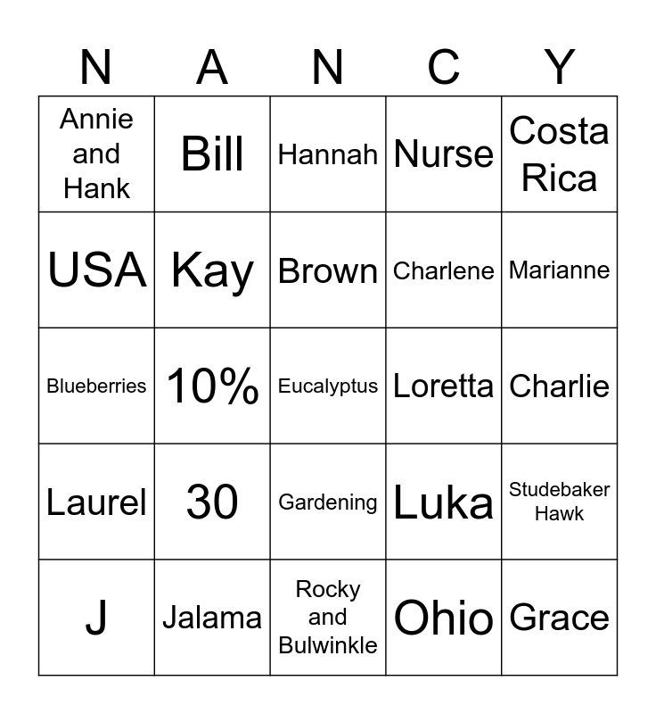 This bingo card has 38 words: San Felipe, Leo, Saint Catherine’s, Kay, Studebaker Hawk, 30, Brown, Frank Sinatra1956, Costa Rica, Charlene, 10%, Nurse, Eucalyptus, Charlie, USA, Laurel, Elvis, Hannah, Pennsylvania, Loretta, Annie and Hank, Jalama, Marianne, J, Saturday, Rocky and Bulwinkle, Grace, 1979, Aliquippa, Herbert Hoover, Laverne, Gardening, Ohio, Bill, CHVA, Luka, Blueberries and 1935.