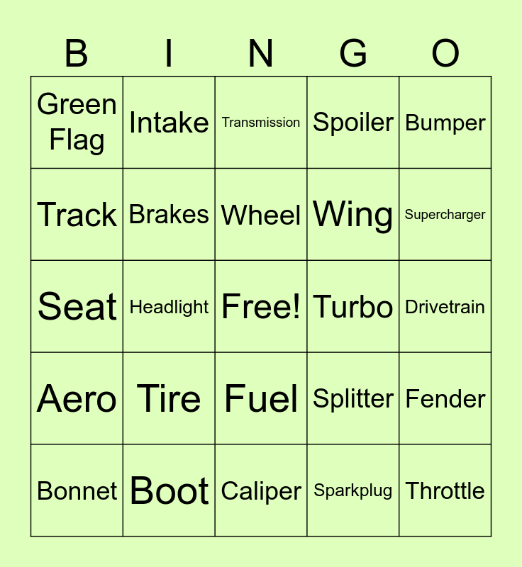This bingo card has a free space and 24 words: Tire, Boot, Wheel, Bonnet, Bumper, Green Flag, Track, Intake, Turbo, Fuel, Wing, Seat, Splitter, Fender, Brakes, Sparkplug, Drivetrain, Transmission, Supercharger, Headlight, Throttle, Aero, Spoiler and Caliper.