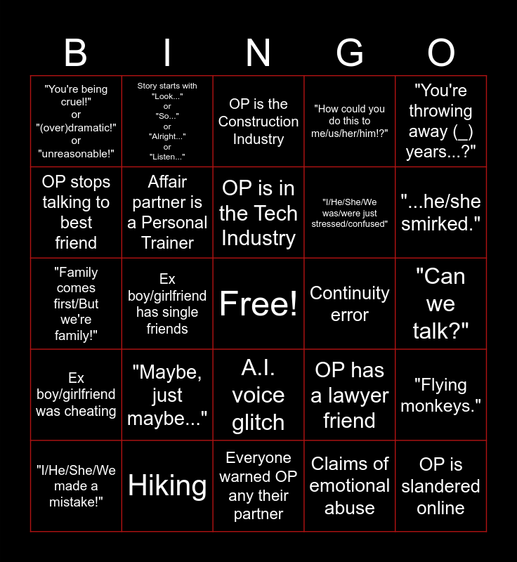 This bingo card has a free space and 24 words: "Maybe, just maybe...", Hiking, OP is in the Tech Industry, "I/He/She/We made a mistake!", "You're throwing away (_) years...?", "You're being cruel!" or "(over)dramatic!" or "unreasonable!", OP stops talking to best friend, Story starts with "Look..." or "So..." or "Alright..." or "Listen...", Continuity error, A.I. voice glitch, "I/He/She/We was/were just stressed/confused", "Family comes first/But we're family!", OP has a lawyer friend, "Flying monkeys.", Affair partner is a Personal Trainer, Claims of emotional abuse, "Can we talk?", OP is the Construction Industry, "...he/she smirked.", Ex boy/girlfriend has single friends, OP is slandered online, Ex boy/girlfriend was cheating, "How could you do this to me/us/her/him!?" and Everyone warned OP any their partner.