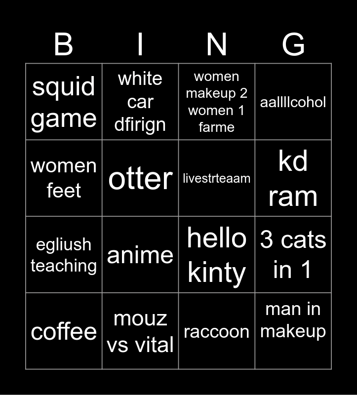This bingo card has 16 words: mouz vs vital, 3 cats in 1, women makeup 2 women 1 farme, squid game, egliush teaching, white car dfirign, hello kinty, raccoon, women feet, otter, coffee, aallllcohol, anime, kd ram, livestrteaam and man in makeup.