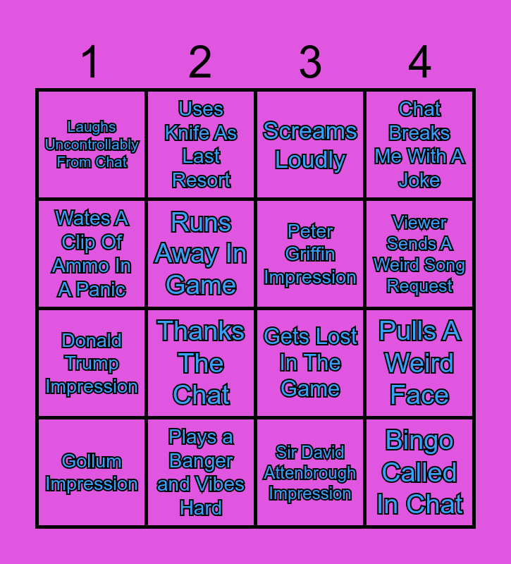 This bingo card has 16 words: Plays a Banger and Vibes Hard, Pulls A Weird Face, Screams Loudly, Laughs Uncontrollably From Chat, Donald Trump Impression, Uses Knife As Last Resort, Gets Lost In The Game, Sir David Attenbrough Impression, Wates A Clip Of Ammo In A Panic, Runs Away In Game, Gollum Impression, Chat Breaks Me With A Joke, Thanks The Chat, Viewer Sends A Weird Song Request, Peter Griffin Impression and Bingo Called In Chat.