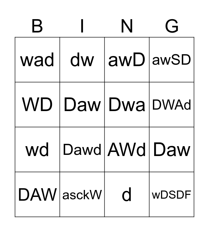 This bingo card has 16 words: asckW, Daw, awD, wad, wd, dw, AWd, d, WD, Daw, DAW, awSD, Dawd, DWAd, Dwa and wDSDF.