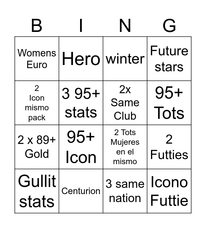 This bingo card has 16 words: Centurion, 2 Futties, winter, Womens Euro, 2 x 89+ Gold, Hero, 2 Tots Mujeres en el mismo, 3 same nation, 2 Icon mismo pack, 3 95+ stats, Gullit stats, Future stars, 95+ Icon, 95+ Tots, 2x Same Club and Icono Futtie.