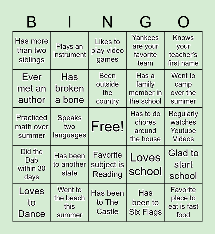 This bingo card has a free space and 29 words: Loves to Dance, Likes to read, Speaks two languages, Reads books about sports, Has more than two siblings, Likes to play video games, Has broken a bone, Has been to another state, Has to do chores around the house, Went to the beach this summer, Regularly watches Youtube Videos, Favorite place to eat is fast food, Has been to The Castle, Has been to Six Flags, Went to camp over the summer, Favorite subject is Math, Favorite subject is Reading, Did the Dab within 30 days, Knows your teacher's first name, Practiced math over summer, Loves school, Prefers dogs over cats, Has a family member in the school, Ever met an author, Yankees are your favorite team, Plays an instrument, Glad to start school, Been outside the country and Like to play sports.
