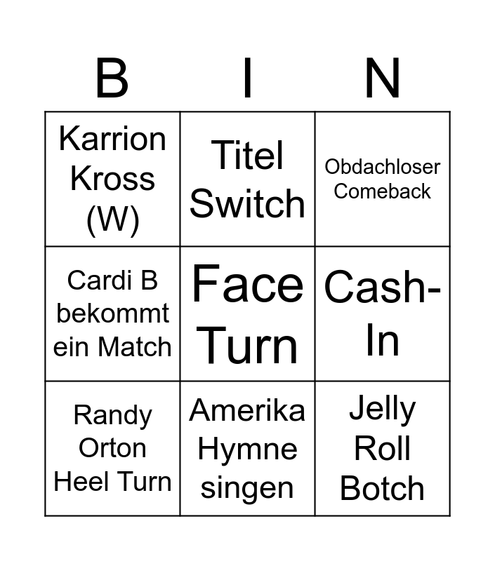This bingo card has a free space and 8 words: Cash-In, Obdachloser Comeback, Titel Switch, Randy Orton Heel Turn, Karrion Kross (W), Jelly Roll Botch, Cardi B bekommt ein Match and Amerika Hymne singen.