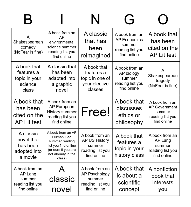 This bingo card has a free space and 24 words: A book from an AP Human Geo summer reading list you find online (or ours if you are not already in the class), A classic novel, A book that features a topic in one of your elective classes, A book from an AP Lang summer reading list you find online, A book that has been cited on the AP Lit test, A Shakespearean comedy (NoFear is fine), A book that features a topic in your science class, A book from an AP environmental science summer reading list you find online, A book that discusses ethics or philosophy, A book from an AP US History summer reading list you find online, A book from an AP biology summer reading list you find online, A book that has been cited on the AP Lit test, A book that features a topic in your history class, A book from an AP Lang summer reading list you find online, A classic that has been adapted into a graphic novel, A book that is about a scientific concept, A book from an AP Government summer reading list you find online, A classic that has been reimagined, A Shakespearean tragedy (NoFear is fine), A book from an AP European History summer reading list you find online, A nonfiction book that interests you, A classic novel that has been adopted into a movie, A book from an AP Economics summer reading list you find online and A book from an AP Psychology summer reading list you find online.