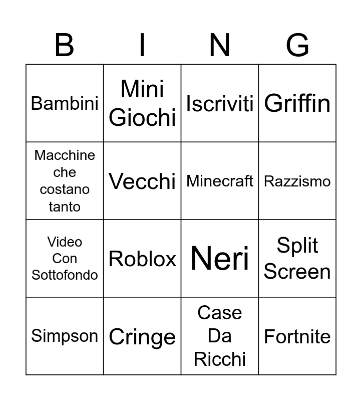 This bingo card has 16 words: Cringe, Split Screen, Iscriviti, Bambini, Video Con Sottofondo, Mini Giochi, Neri, Case Da Ricchi, Macchine che costano tanto, Vecchi, Simpson, Griffin, Roblox, Razzismo, Minecraft and Fortnite.