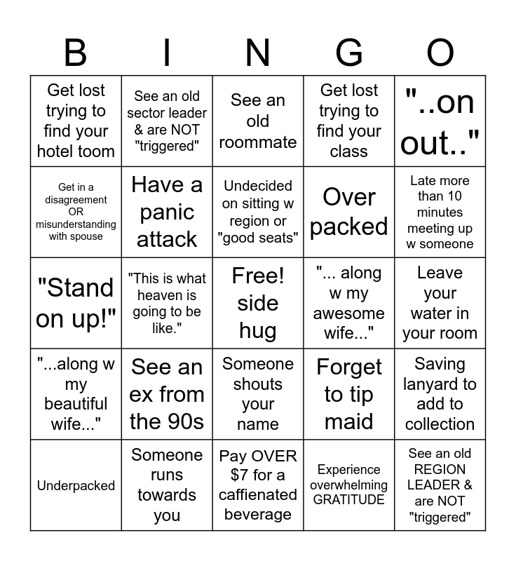 This bingo card has a free space and 24 words: See an ex from the 90s, Someone runs towards you, Undecided on sitting w region or "good seats", Underpacked, "..on out..", Get lost trying to find your hotel toom, Get in a disagreement OR misunderstanding with spouse, See an old sector leader & are NOT "triggered", "... along w my awesome wife...", Someone shouts your name, Over packed, "Stand on up!", Forget to tip maid, Saving lanyard to add to collection, Have a panic attack, Experience overwhelming GRATITUDE, Leave your water in your room, See an old roommate, Late more than 10 minutes meeting up w someone, "This is what heaven is going to be like.", See an old REGION LEADER & are NOT "triggered", "...along w my beautiful wife...", Get lost trying to find your class and Pay OVER $7 for a caffienated beverage.