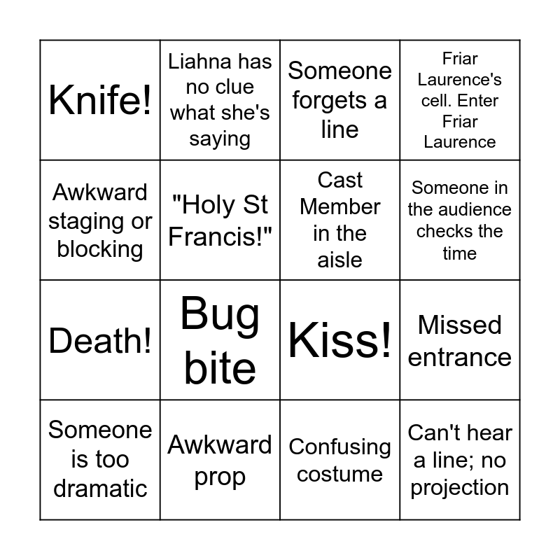 This bingo card has 16 words: Awkward prop, Missed entrance, Someone forgets a line, Knife!, Death!, Liahna has no clue what she's saying, Kiss!, Confusing costume, Awkward staging or blocking, "Holy St Francis!", Someone is too dramatic, Friar Laurence's cell. Enter Friar Laurence, Bug bite, Someone in the audience checks the time, Cast Member in the aisle and Can't hear a line; no projection.