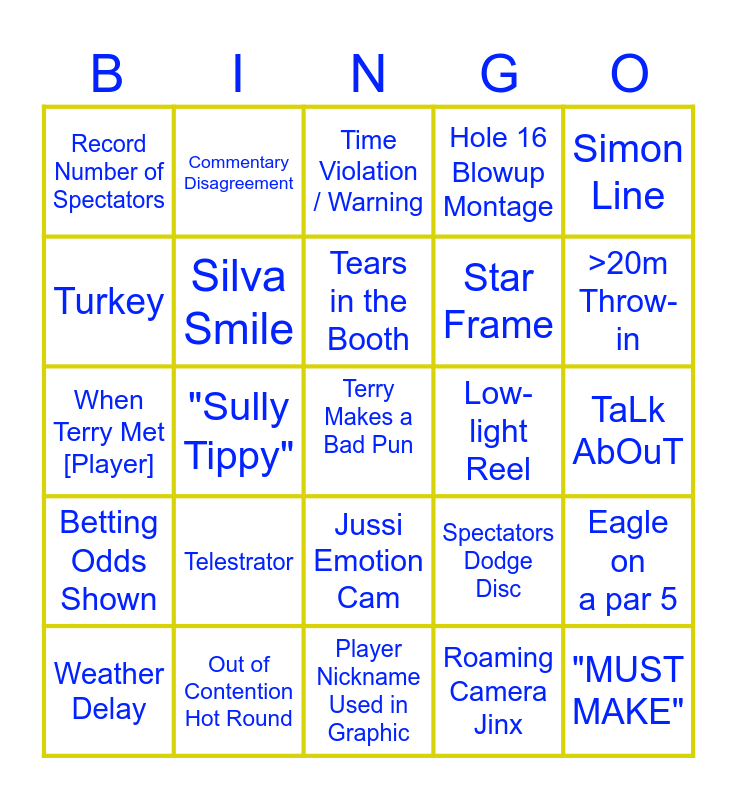 This bingo card has a free space and 44 words: No Response From On-Course, "MUST MAKE", Spectator hit by disc, Weather Delay, Wrong Graphic, Roaming Camera Jinx, Time Violation / Warning, Former WC gets forked (bad scorecard shown), Simon Line, Out of Contention Hot Round, Hole 16 Blowup Montage, Low-light Reel, Jussi Emotion Cam, Telestrator, Brian/Perk Weather check, Player Nickname Used in Graphic, Giant IRL Scoreboard, When Terry Met [Player], 3+ Putt, >20m Throw-in, Commentary Disagreement, ACE, Tombstone, Record Number of Spectators, Death Putt Roll Away, TaLk AbOuT, Imperial Instead of Metric, BIG C2 Putt, Spectators Dodge Disc, Betting Odds Shown, Eagle on a par 4, Eagle on a par 5, Spotter hit by disc, UMBRELLA GATE, "Sully Tippy", McBattle Montage, Disc Mold Mentioned, "MUST MAKE" (Front 9), Tears in the Booth, Turkey, Star Frame, 6-Pack, Silva Smile and Walk n talk.