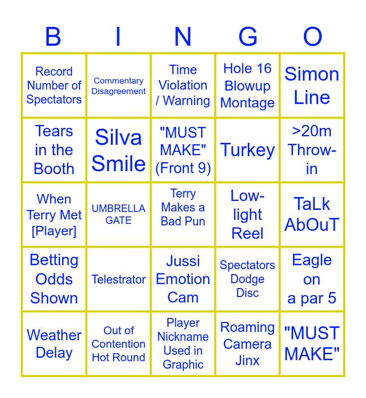 This bingo card has a free space and 43 words: No Response From On-Course, "MUST MAKE", Spectator hit by disc, Weather Delay, Wrong Graphic, Roaming Camera Jinx, Time Violation / Warning, Former WC gets forked (bad scorecard shown), Simon Line, Out of Contention Hot Round, Hole 16 Blowup Montage, Low-light Reel, Jussi Emotion Cam, Telestrator, Brian/Perk Weather check, Player Nickname Used in Graphic, Giant IRL Scoreboard, When Terry Met [Player], 3+ Putt, >20m Throw-in, Commentary Disagreement, ACE, Tombstone, Record Number of Spectators, Death Putt Roll Away, TaLk AbOuT, Imperial Instead of Metric, BIG C2 Putt, Spectators Dodge Disc, Betting Odds Shown, Eagle on a par 4, Eagle on a par 5, Spotter hit by disc, UMBRELLA GATE, "Sully Tippy", McBattle Montage, Disc Mold Mentioned, "MUST MAKE" (Front 9), Tears in the Booth, Turkey, Star Frame, Silva Smile and Walk n talk.