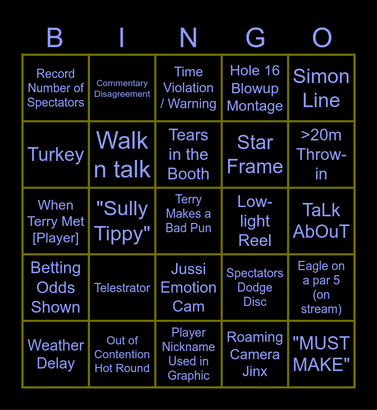 This bingo card has a free space and 44 words: No Response From On-Course, "MUST MAKE", Spectator hit by disc, Weather Delay, Wrong Graphic, Roaming Camera Jinx, Time Violation / Warning, Former WC gets forked (bad scorecard shown), Simon Line, Out of Contention Hot Round, Hole 16 Blowup Montage, Low-light Reel, Jussi Emotion Cam, Telestrator, Brian/Perk Weather check, Player Nickname Used in Graphic, Giant IRL Scoreboard, When Terry Met [Player], 3+ Putt, >20m Throw-in, Commentary Disagreement, ACE, Tombstone, Record Number of Spectators, Death Putt Roll Away, TaLk AbOuT, Imperial Instead of Metric, BIG C2 Putt, Spectators Dodge Disc, Betting Odds Shown, Eagle on a par 4 (on stream), Eagle on a par 5 (on stream), Spotter hit by disc, UMBRELLA GATE, "Sully Tippy", McBattle Montage, Disc Mold Mentioned, Schlabach EYES the Camera, Tears in the Booth, Turkey, Star Frame, Silva Smiles, Walk n talk and Good Throw From A Knee.