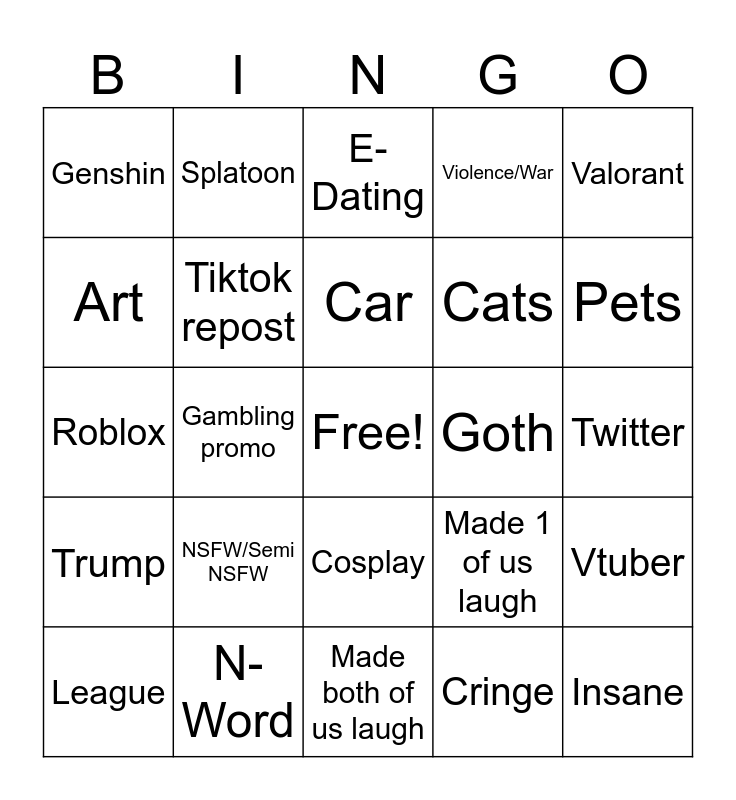 This bingo card has a free space and 24 words: NSFW/Semi NSFW, N-Word, Car, League, Valorant, Genshin, Art, Splatoon, Goth, Cosplay, Cats, Roblox, Made 1 of us laugh, Vtuber, Tiktok repost, Cringe, Twitter, E-Dating, Pets, Gambling promo, Insane, Trump, Violence/War and Made both of us laugh.