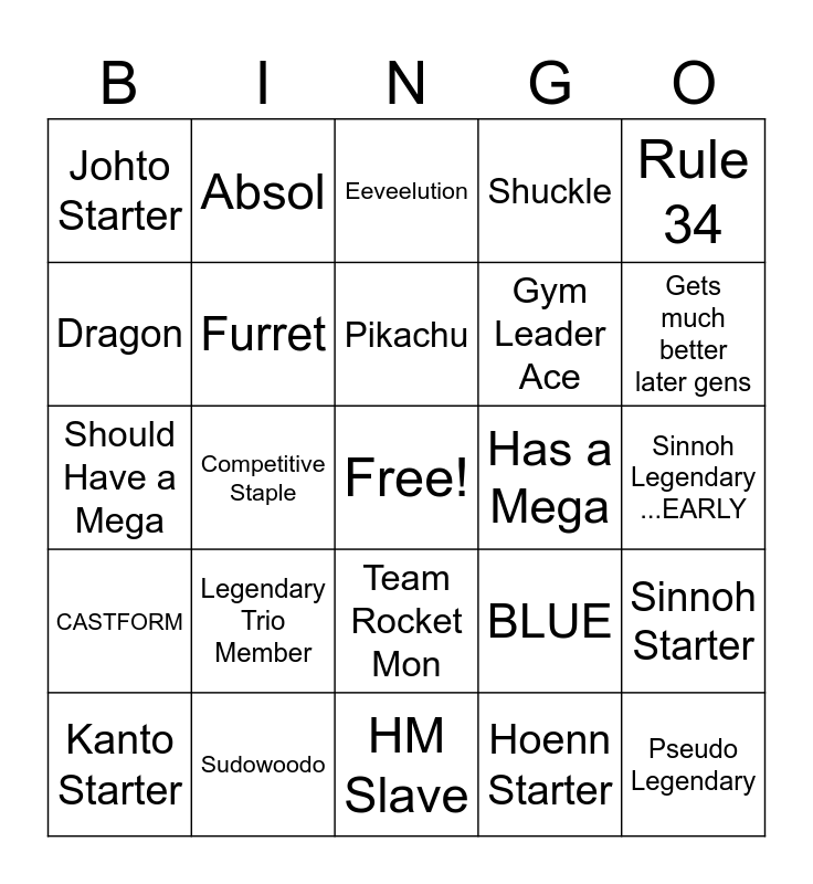 This bingo card has a free space and 24 words: Legendary Trio Member, Sudowoodo, Pikachu, Kanto Starter, Rule 34, Johto Starter, Dragon, Absol, Has a Mega, Team Rocket Mon, Gym Leader Ace, Should Have a Mega, BLUE, Sinnoh Starter, Furret, Hoenn Starter, Sinnoh Legendary ...EARLY, Eeveelution, Gets much better later gens, Competitive Staple, Pseudo Legendary, CASTFORM, Shuckle and HM Slave.