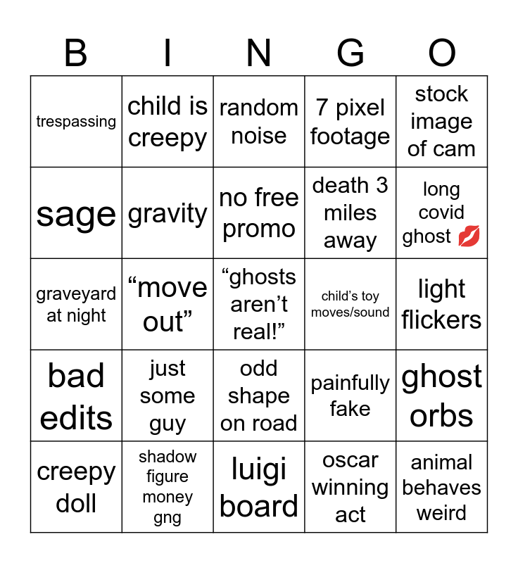 This bingo card has a free space and 24 words: creepy doll, just some guy, no free promo, oscar winning act, stock image of cam, trespassing, child is creepy, random noise, child’s toy moves/sound, light flickers, graveyard at night, gravity, painfully fake, ghost orbs, sage, shadow figure money gng, luigi board, 7 pixel footage, long covid ghost 💋, bad edits, “move out”, odd shape on road, death 3 miles away and animal behaves weird.